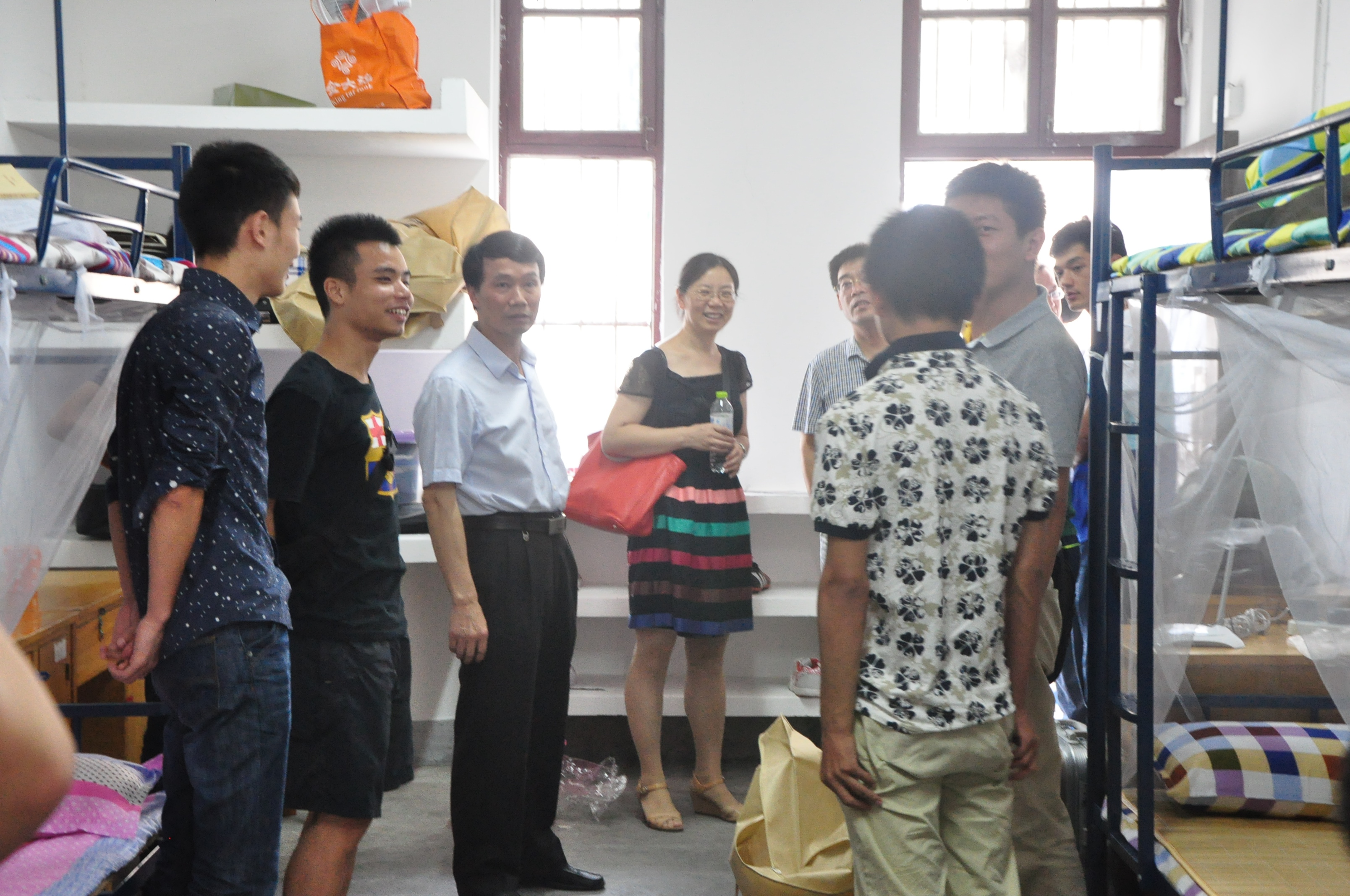 9月9日下午四点,为了解新生入住情况,信工学院院党委书记黄菊,副院长胡友健、刘修国,副书记许德华和2015级各班班主任一同走访所有的新生宿舍。