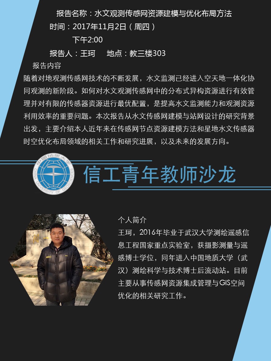 内容摘要:随着对地观测传感网技术的不断发展,水文监测已经进入空天地一体化协同观测的新阶段。如何对水文观测传感网中的分布式异构资源进行有效管理并对有限的传感器资源进行最优配置,是提高水文监测能力和观测资源利用效率的重要问题。本次报告从水文传感网建模与站网设计的研究背景出发,主要介绍本人近年来在传感网节点资源建模方法和星地水文传感器时空优化布局领域的相关工作和研究进展,以及未来的发展方向。