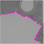 为了验证方法的有效性与适应性,基于高分二号上目视解译的参考海岸线,本文从landsat8 OLI图像中选择了5条具有不同海岸环境、不同形态、不同类型海岸线作为实验区域,算法提取的视觉效果如图1,对提取结果进行精度分析,结果如表1。其中,均方根误差(RMSE)范围为3.02米到4.77米;线匹配度(LM)范围从2.51米到3.72米,这说明本文算法对不同形态的海岸线具有一定的有效性和适用性,且具有稳定的亚像元定位精度。除此之外,本文通过比较亚像元海岸线提取结果与参考海岸线的长度,验证了算法对海岸线细节的保存性,结果如表2。