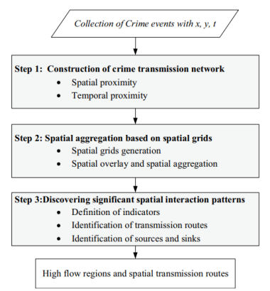 理解犯罪事件的时空分布模式对理解犯罪发生机制、制定犯罪预防策略起着重要的指导作用。犯罪事件的空间分布与空间环境密切相关(如:土地利用、典型设施等),因而呈现出“时空聚集”的特征。实质上,犯罪事件的时空聚集特征可以从两个方面理解:(1)空间聚集性,即犯罪事件的分布总伴随着“热点区域”;(2)时空交互性,即如果在某一特定地区发现了犯罪事件,那么在一段时间后,周围地区可能会经历类似犯罪事件发生的风险增加。犯罪事件在邻近时空范围的交互作用,也被成为“邻近重复”现象。现有“邻近重复”的研究大多采取统计学方法,回答犯罪事件在多大空间范围、时间范围内呈现明显的聚集特征,却未能充分顾及犯罪事件周围环境的异质性特征,因此难以详细揭示犯罪事件在空间详细的传播规律。