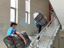早上发车去未来城时,为方便同学们搬运行李,学校的通勤车停在宿舍的旁边,宿管阿姨也帮忙打开了离停车地点最近的宿舍门,在此过程中,每个同学都早早的打包好自己的行李,同学们互相帮助,班里的男同学还有我们的班主任老师都来女生宿舍这边帮忙行李装车,最后我们如期从南望山出发去未来城。到达未来城时,搬运行李的志愿者也早早地等在宿舍楼道里,我们班里的男生自己的行李都还未安置好就过来帮我们女生这边搬运行李,无论是班里的男生还是志愿者还是一路随行的班主任陈万旭老师、辅导员胡昌宏老师,他们一趟又一趟地帮我们搬运行李,从一楼搬运到五楼,尽管汗如雨下,他们也没有半句怨言,尽管是无人顾及的行李也被他们搬运到了楼上,只是因为他们所说的那句善始善终。正是因为大家的帮助,在搬宿舍的过程中虽然很艰辛,但是却充满温暖,很感谢大家的帮忙!初次来到未来城,未来城的环境也十分舒适,是个适合学习的好地方!